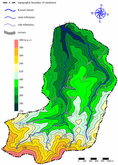 The investigated catchment of the Korzeń stream and its tributaries is located in the Ciężkowice Foothills in the eastern part of the Małopolskie Voivodeship, in the southern part of Poland. The catchment is dominated by arable land and plant production. It is under pressure from natural factors, mainly water erosion and leaching of soils, as well as anthropogenic factors, mainly related to agricultural activities and rural settlement, including problems with water and sewage management and traffic loads. The stocking density of livestock during the study period was quite low. The total density of the asphalt and paved roads, as well as agricultural and forest roads, is 8.64 km·km−2. The study area is situated between 21°3.17″ and 21°12.25″ east longitude, and between 49°50.35″ and 49°58.57″ north latitude. According to the Kondracki division [14], the catchment is located in the province of the Western Carpathians and the subprovince of the Outer Western Carpathians.