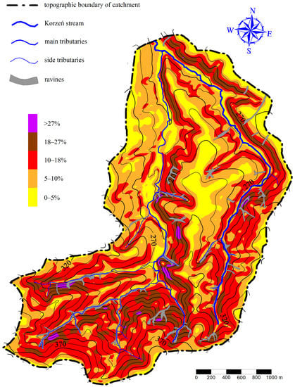 In the Korzeń stream catchment, the weighted average land gradient is 11%. Slopes of 5–10% and 10–18% dominate, which occur on 33.5% and 37.5% of the area, respectively. The slopes above 27% cover only 7.4 ha (0.8%) of the area, the share of slopes between 18% and 27% is 11.9%, and the slopes smaller than 5% occupy 16.3% of the area (Figure 2). In the Korzeń stream catchment area, the majority are areas with northern, north-eastern, and north-western exposures, which together, cover 49.5% of the area. There is also a significant share of the eastern and western exposure areas, whose share in the catchment area is 17.6% and 11.4%, respectively. The areas with southern exposures that are the most favorable from an agricultural point of view cover 21.5% of the area.
