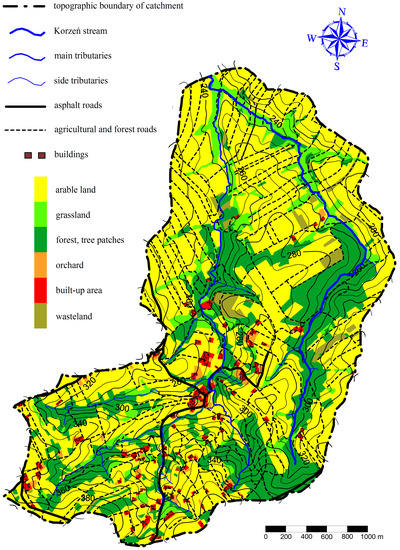 In the Korzeń stream catchment area, because of the average land gradients and fertile soils, there is 60.7% of arable land in the area. The arable land is evenly distributed throughout the object and is cultivated mainly with wheat, potatoes, and fodder beet. Grasslands, amounting to 7.7% of the catchment area, occur almost exclusively in the river valleys. The forestation of the catchment area of the Korzeń stream is 25.9%. Larger forest areas, mainly with beech, oak, and fir stand, are located in the central and eastern part of the catchment, while minor wooded and shrubby enclaves occur along all of the watercourses. In addition, there is only a small percentage (2.1%) of uncultivated agricultural land in the catchment, and 23.1 ha (2.4%) of the areas are with scattered development—they are located in the central and southern part of the catchment, unfortunately very often close to watercourses.