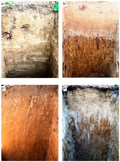 Soil profiles in the studied catchment: (a) Stagnic Cambisol, (b) Stagnic Luvisol, (c) Hamplic Cambisol, and (d) Albic Podzol.