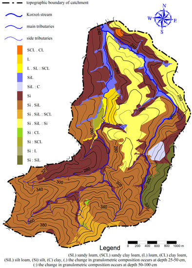 The catchment of the Korzeń stream is characterized by a small typological diversity of soils. The dominant soils are Luvisols, Hamplic Cambisols, and Stagnic Cambisols, which have a 51.6%, 37.5%, and 9.2% share, respectively, in the catchment area (Figure 4). In 92.1% of the area, the topsoil genetic layers are made up of silt (Si), and there are also silt loam (SiL), loam (L), and sandy clay loam (SCL). In the largest area, Luvisols are found on the tops and slopes, in all parts of the catchment area of the Korzeń stream. These soils are mostly made up of silt (Si) lined with silt loam (SiL). In the southern part of the catchment, mostly under forests, there are Hamplic Cambisols formed from sedimentary rocks with a non-carbonate binder. They are made up of silt (Si) and loam (L), passing at a depth of 25–50 cm into weekly skeletal sandy loam (SL) deposited on rubble or rocky soils. In the valleys of the Korzeń stream and its tributaries, there are almost exclusively Stagnic Cambisols (Figure 5). In various parts of the catchment (Figure 5), they developed from silt loam (SiL), silt (Si), and loam (L).