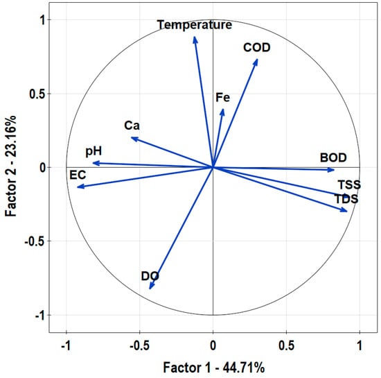 The outflow of suspended sediment solids from settlement and agricultural areas is connected with the physiographic parameters of the catchment, and increased concentrations of nitrate nitrogen and total phosphorus in surface waters [29]. The reason for this is the unregulated water and wastewater management in the catchment area. Spatial relationships with factors such as the topography, slope, and exposure of the catchment have an impact on its use and water quality in the catchment [52]. Our research indicates that the reason for this trend is agricultural activity, which intensifies the runoff of TSS. However, water quality assessment, covering also calcium ions, should be carried out. The multidimensional analysis showed that the components that significantly explained the variability of the physicochemical parameters with the largest anthropogenic transformations of the catchment had 67.9% of the explanatory variance, and could show an influence on the water quality. Graphically, the PCA results are illustrated in the data projection in the two-dimensional space shown in Figure 6. Investigations of the influence of the physicochemical composition showed that BOD, COD-Mn, and Fe were one of the key factors influencing water quality. The high share in the use structure of arable land and building development clearly translated into a change in water chemistry, resulting mainly in an increase in the concentration of nitrates, ammonium ions, phosphates, and sulphates, and in the cations of sodium, potassium, calcium, and magnesium [45]. To sum up, the most general conclusion is that the use of the catchment area of small water bodies has a significant impact, however, only in relation to magnesium and potassium cations [53]. The obtained results of these studies allow us to conclude that the use of the catchment area should be connected with the study of the quality of water running off in built-up rural areas. In the case of the assessment of seasonal differences, significant differences in the magnesium and calcium concentration fluctuations translate into a change in water chemistry, which is illustrated by the large separation of the reservoir waters area [54].