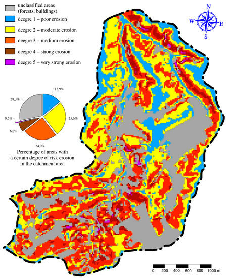In the catchment, the urgent protection of the land against erosion is required. The land use structure was assessed using the erosion hazard classification, requiring comprehensive anti-erosion measures [24]. In the Korzeń stream catchment area, there was a relatively large area of land threatened by moderate erosion—25.6% of the area. In total, more than 32% of the area was at risk of medium, strong, and very strong water erosion (degrees 3, 4, or 5). The smallest slopes of the area, with a water erosion of degree 1, covering 13.9% of the area of the examined catchment, caused only small arable, topsoil run-off, and the losses resulting from this could be easily removed by tillage means. Moreover, 0.5% of the catchment area was at risk of very strong erosion, devastating the entire soil profile along with the bed, and in extreme cases, leading to permanent land degradation (Figure 7).