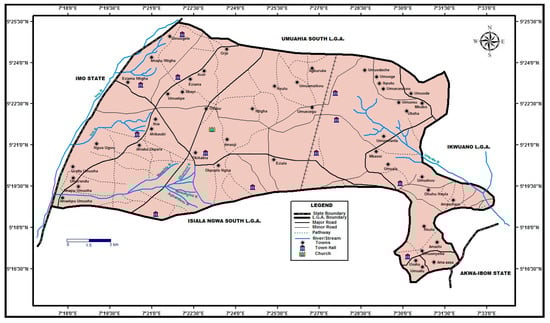 The study was based on Isiala Ngwa North LGA of Abia State Southeastern, Nigeria. It is an LGA with 40 communities covering an area of about 83.5km2 (Figure 1) and lies approximately within latitudes 05°21’ and 05°29’ N and longitudes 07°18’ and 07°22’ E. It is within the Af climate of Koppen’s classification, with two distinct seasons, the rainy and dry seasons. The rainy season is between April and October, while the dry season is from November to March.