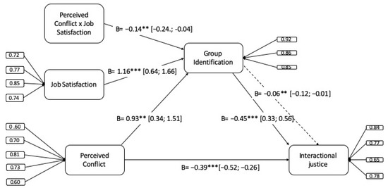 Lastly, we can affirm that the moderated mediation analysis is significant too. Conflict (X) shows an effect on interactional justice (Y) through group identification (M), this relationship being moderated by job satisfaction (W) (B = −0.06, SE = 0.03, 95% CI [−0.12; −0.01]). Just taking into account group identification, this variable is statistically significant related to organizational justice (B = 0.45, SE = 0.59, 95% CI [0.33; 0.56]). Therefore, job satisfaction and group identification minimize the impact of perceived conflict over organizational justice. Concretely, when there are higher values of job satisfaction, the relationship between perceived conflict and interactional justice is not significant. At values above the 84th percentile, the coefficients are B = 0.05; SE = 0.03, 95% CI [−0.01; 0.11]. The complete statistical model is reflected in the Figure 2.