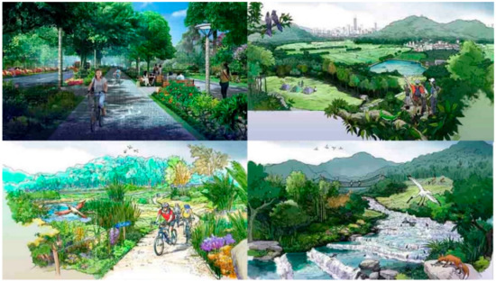 The conceptual scenes of the Pearl River Delta (PRD) greenways that were provided as a reference for the respondents. (Source: Department of Housing and Urban-Rural Development of Guangdong Province [37] (pp. 251–253)).