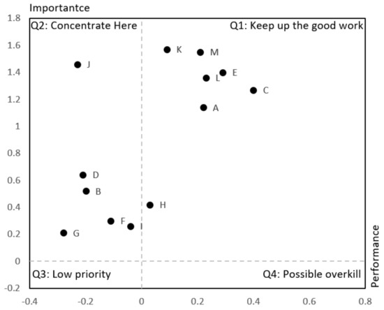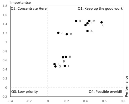 We further adopt the importance-performance analysis (IPA) to conduct an in-depth investigation on the perceptions of greenway functions and performance. The result of the public group (Figure 5) showed that the respondents had a general positive perception of the greenways and that the greenways were recognized for the benefits and performance in the recreational dimension, including C) “urban greening,” M) “attractiveness,” E) “recreational resource,” L) “comfort,” and A) “access to natural environment.” Moreover, public group respondents suggested disinterest in some of the policy goals that were proposed in greenway planning, such as I) “rural economic transformation,” G) “cultural heritage,” F) “experience of rural life,” B) “biodiversity of species,” and H) “tourism economy.” In comparison with the results of the public group, the IPA analysis on the professional group (Figure 6) had a similar pattern, in which the recreational benefits were recognized and indicated that greater emphasis should be placed on J) “coherence.” Moreover, the professional group indicated that the social, economic, and environmental policy goals should be highlighted in future improvement strategies.