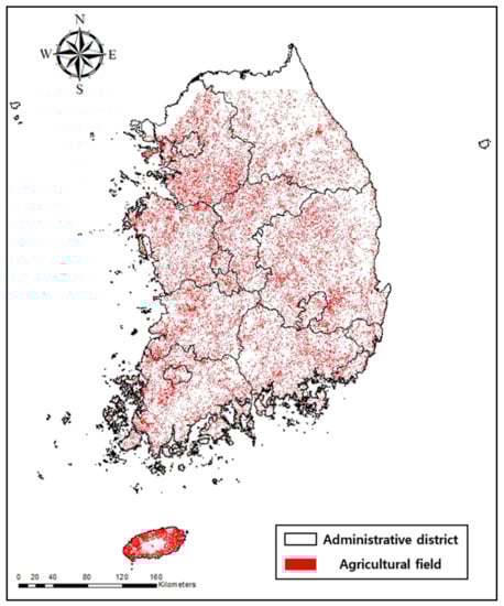 Distribution of agricultural fields in South Korea.