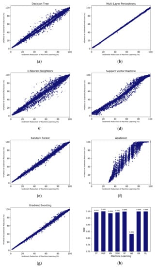 The most successful machine learning approach tested here was the MLP model. The test data were used to calculate the sediment trapping efficiencies of each machine learning model and the efficiency values calculated in the VFSMOD-W were compared to the efficiencies estimated by machine learning models (Figure 2a–g). Figure 2a–g shows that the sediment trapping efficiency calculated by the MLP regression model is most similar to that of VFSMOD-W. Figure 2h shows a bar graph for easy comparison of NSE of seven machine learning models, which indicates that the results of MLP, gradient boosting and random forest are excellent. Especially MLP has the best results among the seven machine learning models. Since single perceptron classification can be performed with only one straight line, it cannot solve the problem that cannot be divided into straight lines. In MLP, however, it is possible to bend the line by creating a hidden layer. Thus, more flexible prediction can be carried out, and since the hidden layer consists of three layers with 50 nodes each, it is more flexible to predict the sediment trapping efficiency.