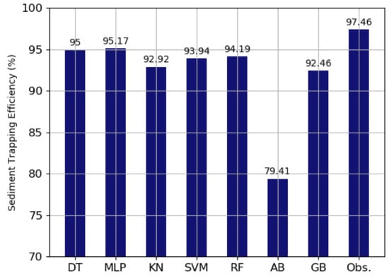 The observations in VFS from the literature review were used to apply the actual situation, and all the machine learning models developed in this study were applied. The study area of VFS in Barfield et al. [44] is a naturally formed karst watershed area. As the input data for the machine learning models, the rainfall was 63.5 mm/hr, and soil texture was specified as loam. The slope was 9%, the area ratio of VFS to a field size was 4.8%, field area was 0.001 ha, the USLE P-factor was 1.0, the USLE C-factor was 0.3, and the CN was 74. The sediment trapping efficiencies predicted in the machine learning models were compared with the observations from Barfield et al. [44] (Figure 3).