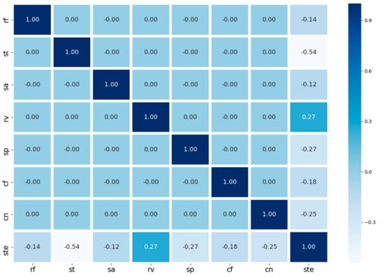 In the end, however, it is difficult to quantify the correlations only by looking at the correlation between the properties and the sediment trapping efficiency class of VFS. Therefore, the correlation between each input data, including the sediment trapping reduction (ste) of VFS which is continuous numerical data was analyzed using a heat map (Figure 5). Soil texture played a major role in controlling sediment trapping efficiency. The heat map shows that the soil texture (st) of VFS has the strongest influence on the sediment trapping efficiency (ste) with −0.54, and The VFS area ratio (rv) is 0.27 with a positive correlation and the slope (sp) has a negative correlation of −0.27. The sediment trapping efficiency (ste) was statistically significant in the paired T-test results from each attribute (p < 0.001). Multicollinearity does not occur when there are strong correlations between independent variables (Table 2).