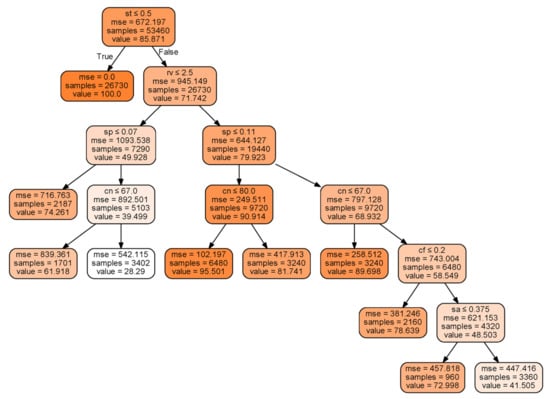 In the seven machine learning regression models, experiments were conducted to set the critical hyperparameters proposed by Müller and Guido [27]. Figure 6 examines how the decision tree method is used to predict the sediment trapping efficiency of VFS. If the maximum number of branches of the decision tree is not determined, a huge distribution with many branches is created. Therefore, in this study, the maximum number of branches (max_leaf_nodes) is set to 10. The mean squared error, which is the classification condition, was calculated to generate a decision tree diagram.