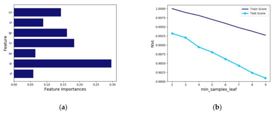 Determining the minimum number of samples required to be at a leaf node (Min_samples_leaf) was conducted to prevent overfitting in the regression function (Figure 7b). When ‘min_samples_leaf’ is 2, the best learning is achieved, and the NSE (coefficient of determination) for test is 0.993. This hyperparameter value stops the tree before the decision tree is completely built by pre-pruning. If ‘min_samples_leaf’ goes over 2, the result shows a tendency to sharply decrease in accuracy.