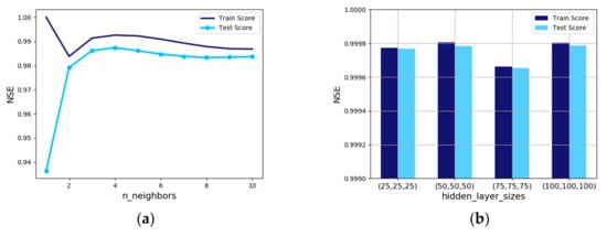 An important hyperparameter in the multilayer perceptron regression model (MLPRegressor) is the hidden layer size. In this study, various tests to determine the optimal hidden layers and nodes were conducted, and the results of the four cases are represented in Figure 8b. The best results were obtained by setting three hidden layers with 50 nodes and hyperparameters were set to the same hidden layer and node size.