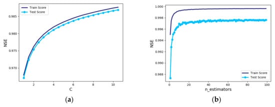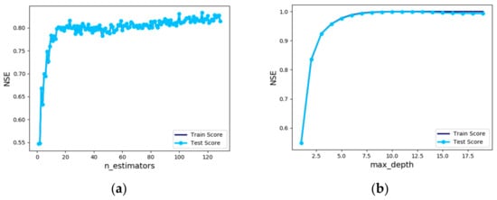 Sensitivity analysis of “n_estimators”, a hyperparameter of the AdaBoost Regressor, was performed. To obtain the most accurate model, the analysis of “n_estimators” was carried out by changing the value from 1 to 129, and the training and test data results showed almost the same trend. When “n_estimators” was validated using the test data, the result showed NSE of 0.831 with 126 learners. Therefore, ‘n_estimators’ of 126 would be appropriate (Figure 10a). In the case of AdaBoost, it is necessary to adjust the ‘learning_rate’ because it shows somewhat lower accuracy by only tuning “n_estimators”. However, the learning rate is adjusted by showing the best NSE of 0.804 at 0.4 and 1 of ‘learning_rate’. The result shows that the accuracy increase cannot be expected greatly. In future studies, it is necessary to study how to produce better results by constructing various combinations of hyperparameters rather than adjusting only a couple of independent hyperparameters.