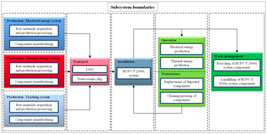 53]. The environmental impact of the HCPV/T 2000x system is higher probably as a result of the higher primary energy demand required during raw materials acquisition/production and manufacturing of the thermal energy and tracking systems.