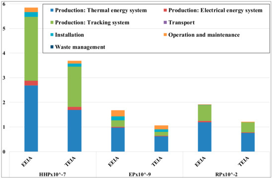 Figure 6. The results are presented separately for the Electrical Energy Impact Allocation (EEIA) and Thermal Energy Impact Allocation (TEIA) for the defined functional units of 1 kWh for the electrical energy and 1 kWh for the thermal energy. At the midpoint level as shown in