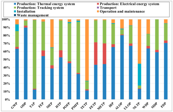 tracking systems are the main contributors to the following 13 impact category indicators: GWP, ODP, TAP, FEP, MEP, HTP, POFP, PMFP, FETP, IRP and FDP. The main contributors to TETP, WDP and ALOP are the