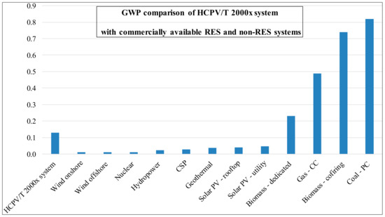 Figure 9 presents the system boundary GWP for EEIA compared with commercially available RES and non-RES systems based on the global average of lifecycle GWP. The RES technologies are wind offshore, solar PV—rooftop, wind onshore, CSP geothermal and solar PV—utility while the non-RES technologies are nuclear, coal power plant (pulverized plant), gas power plant (combined cycle), biomass power plant (co-firing), biomass power plant and hydropower. The GWP of the RES systems is 63–92% lower than the HCPV/T 2000x system. The GWP of the non-RES technologies (except for nuclear) is 77%–532% higher than the HCPV/T 2000x system while the GWP of the nuclear is 91% lower. The main reason for the higher GWP of the non-RES systems is probably as a result of fossil fuel combustion [