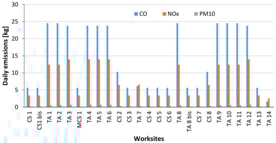 Given the hourly emission for each type of worksite and considering the daily activities, Figure 2 illustrates the distribution of the daily emissions along the worksites of the future motorway. In addition to what was already observed, it is remarkable that emissions are up to five times higher in some worksites than others, and this is true for all the pollutants.
