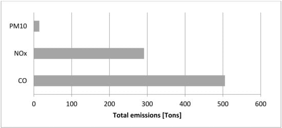 CO is the pollutant emitted in the highest quantity mainly by the machineries and plants. Results show that during the construction stage of the motorway, about 500,000 kg of CO will be produced. An important contribution of about 300,000 kg is also provided by the nitrogen oxides (NOx). Significantly lesser quantities are the result of VOC, NO2 and C6H6. The emission of PM10 is one order of magnitude less with respect to CO and NOx, but it produces the most perceived and undesired effects of the construction process in the interested communities [34,35].