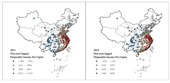 | LnIncome t-1 | Logarithm of one-year-lagged per capita disposable income of urban households | 9.97 | 0.27 | 9.24 | 10.75 | 808 | “China City Statistical Yearbook” |