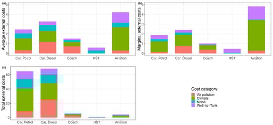 (a) Average external environmental costs (in €-Cent/pkm); (b) Marginal external environmental costs (in €-Cent/pkm); (c) Total external environmental costs 2016 for EU28 (in Billions € per year) []. Different scales are used. For marginal costs the following vehicle types were assumed: Car, Petrol, Medium, 1.4–2.0 l, EURO V; Car, Diesel, Medium, 1.4–2.0 l, EURO V; Coach, Diesel, Standard <= 18 t, EURO V; High-speed train; Aviation, Short Haul.