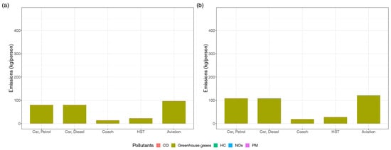 Holiday-trip emissions (a) for ; (b) for . Emissions of CO, HC, NOX and PM are so low (relative to greenhouse gases) that they are nearly insignificant, and thus invisible.