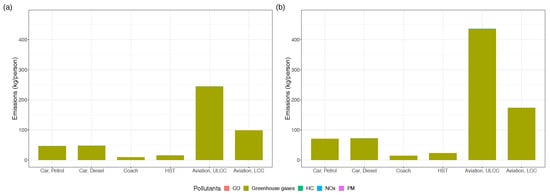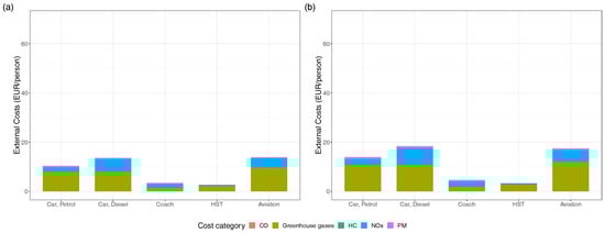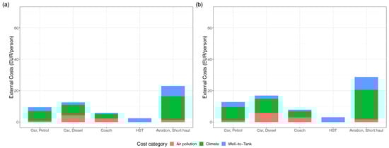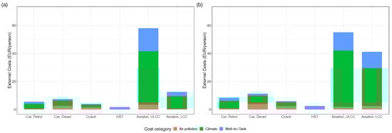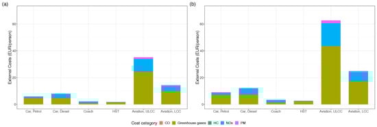 Holiday trips. (a) (External) environmental costs for , (b) (External) environmental costs for (on the basis of Reference []). In (b) external costs of ultra-low cost carriers (ULCCs) consider a medium-haul flight and are therefore lower.