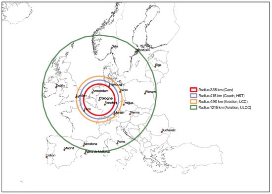 That is, we firstly determine maximum transport-mode-specific distances. For the purpose of illustration, we display these distances in Figure 5, where we summarize the results for cars as well as coaches and HST in one category each, as their maximum distances differ only by 10 to 15 km. For all radii, Cologne was chosen as the point of departure. The outer edge of the circles around the starting point then display the maximum transport-mode-specific distances for the given full-price budget. We find that a consumer can travel the largest distance by aviation (∼1215 km ⇔ Mallorca), whereas all other transport modes yield similar distances (∼330–420 km ⇔ North Sea/Baltic Sea). Consequently, this contributes to a higher climate disadvantage of aviation.