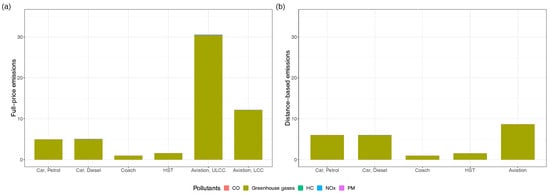 (a) Full-price emissions; (b) Distance-based emissions. Emissions of CO, HC, NOX and PM are so low (relative to greenhouse gases) that they are nearly insignificant, and thus invisible.