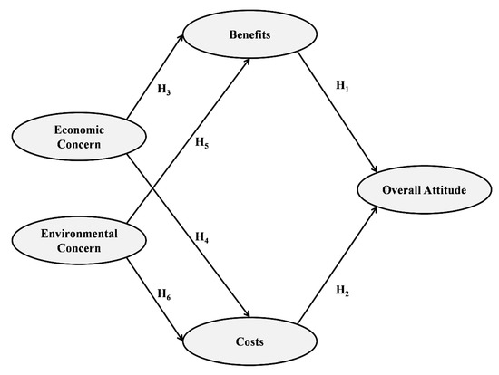 Until now, the part of the model that has been widely studied and constitutes the core of causal models on resident attitudes [49,61,71,73,77] has been discussed. This part of the model is a logical consequence of Social Exchange Theory, a very common theoretical foundation in studies on residents’ attitudes [3,18,20,21,25,29,30,31,39,53,54]. We add innovative elements to these basic causal relationships: environmental concern and economic concern. Concerns, as causes of the variations in the perceptions of residents, have been rarely studied.