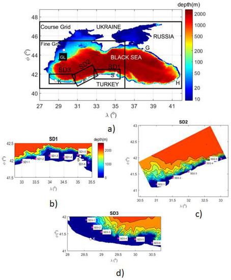 (a) Map of the Black Sea. The computational domain for the Simulating Waves Nearshore (SWAN) model is enclosed by the black rectangles (the nested grids). The outermost black rectangle represents the computational coarse domain. Inner black rectangle shows the boundaries of the finer grid and the innermost black rectangles are presented as the sub-grid domains SD1, SD2, and SD3; (b) Mab of the sub-grid domain SD1; (c) Mab of the sub-grid domain SD2; (d) Mab of the sub-grid domain SD3. The measurements in white points are used in the model development, calibration, and validation. The letters GL, G, H, S, F, and K refer Gloria, Gelendzhik, Hopa, Sinop, Filyos, and Karaburun buoy locations, respectively. The positions of the stations selected in three sub-domains are shown by pink circles and color bars and color maps present bathymetries for the entire Black Sea and three sub-grids. φ and λ represent latitudes and longitudes.