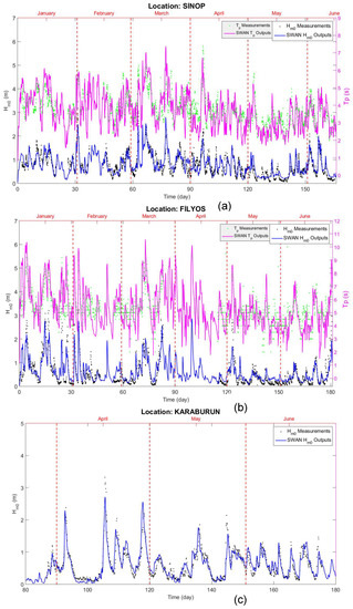 Time series comparison of model hindcasts against the measurements at three buoy locations in the sub-grid domains. The data for the first six months of 1996 and 1995 at (a) Sinop and (b) Filyos buoy locations in SD1 and SD2 sub-grid domains, respectively, and between March and June 2004 at (c) Karaburun in SD3 sub-grid domain is used. The names of the buoy locations are shown in the title.