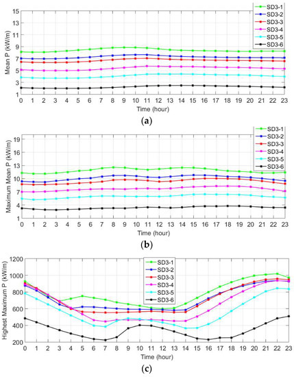 (a) Long-term hourly variations during the day for average wave power, (b) average maximum power and (c) the highest maximum power values determined depending on values of maximum wave power for each year for the period 1979 to 2009 at the selected locations in SD3 (Karaburun) sub-domain.