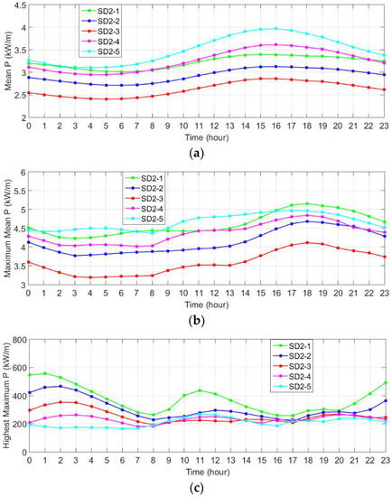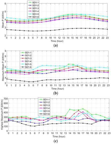 According to Figure 6, in the Sinop sub-grid, the average power, except station 6 is between 3.5 and 4.5 kW/m. The average power at station 6 is between 3 and 2.5 kW/m. All stations consist of a higher average power in the time interval of 10:00 to 19: 00. Sinop stations (excluding station no. 6) offer higher hourly average power than the stations in Filyos and lower values than the Karaburun stations (excluding station no. 6). The average highest power has values in the range of 6.5 to 5 kW/m at all stations except for station 6 whose value is below 4 kW/m. The highest maximum power is about 490 kW/m at station 1 from 14:00 to 17:00. Finally, we can conclude from the results obtained for three sub-grids that there is a higher energy during the day at all stations. In addition, there are a very low fluctuations in mean wave power during the day in the western part while at the eastern stations mean wave energy flux shows higher fluctuations.