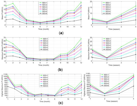 (a) Monthly and seasonal variations for average wave power, (b) average maximum power and (c) the highest maximum power values determined depending on values of maximum wave power for each year for the period 1979 to 2009 at the selected locations in SD3 (Karaburun) sub-domain. In the subplots, indicating the seasonal variations (from the right side), 1 indicates Spring, 2- Summer, 3- Autumn and 4- Winter.