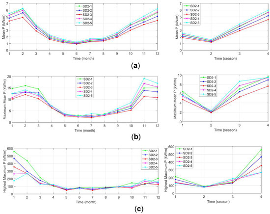 (a) Monthly and seasonal variations for average wave power, (b) average maximum power and (c) the highest maximum power (c) values determined depending on values of maximum wave power for each year for the period 1979 to 2009 at the selected locations in SD2 (Filyos) sub-domain. In the subplots, indicating the seasonal variations (from the right side), 1 indicates Spring, 2- Summer, 3- Autumn and 4- Winter.