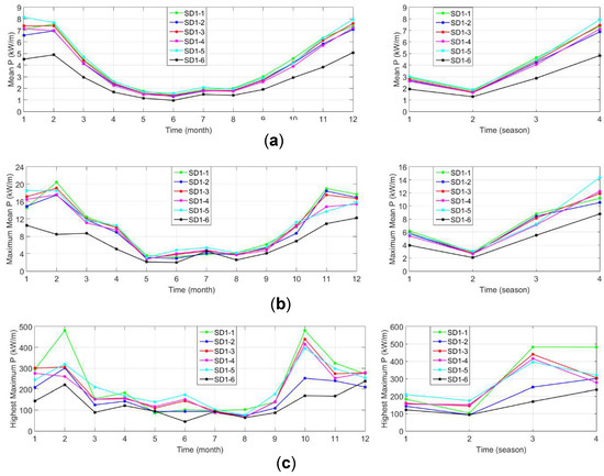 After examining the hourly variations of the wave power, monthly, and seasonal average power, average highest power and the highest maximum power values were determined for each station in each sub-grid. After that, monthly and seasonal variations of these values were also examined. Their graphical comparisons are presented in Figure 7, Figure 8 and Figure 9. As can be seen from Figure 7, in the Karaburun sub-grid, the average wave power is lowest at all stations in summer months (May, June, and July), while it is the highest in winter months (December, January, and February). In the monthly and seasonal variations of the average wave power, it is seen that the average power decreases from the west to the east of the sub-grid. The highest average power is 18 kW/m at station 1 in December and 16 kW/m in the winter, and the lowest average power at station 6 in April to July and in summer is less than 1 kW/m. Monthly and seasonal variation of average highest power has similarities to that of the average wave power at the stations. The largest value of the average highest power at station 1 is about 65 kW/m in December, while the lowest value is very close to zero at station 6 in May to July. In addition, the average highest power value is around 28 kW/m at station 1 in winter compared with the other stations, while this value is very close to zero in summer at station 6. The maximum value of the highest maximum power in the Karaburun sub-grid was obtained at approximately 1050 kW/m in January at station 1. Highest values of this parameter were obtained at all stations in winter (1000 kW/m station 1 and 550 kW/m station 6), while the lowest in summer (200 kW/m station 1 and 100 kW/m station 6).