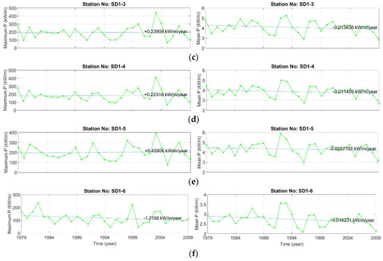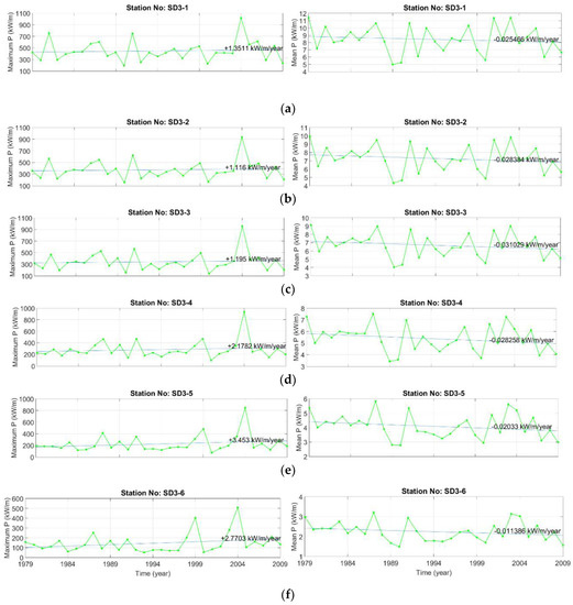 Annual maximum and average wave power variations and linear trends for selected stations in Karaburun SD3 sub-domain for the years 1979 to 2009. (a) station SD3-1; (b) station SD3-2; (c) station SD3-3; (d) station SD3-4; (e) station SD3-5; (f) station SD3-6.