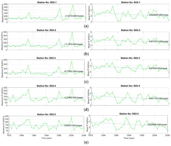 Annual maximum and average wave power variations and linear trends for selected stations in Filyos SD2 sub-domain for the years 1979 to 2009. (a) station SD2-1; (b) station SD2-2; (c) station SD2-3; (d) station SD2-4; (e) station SD2-5.
