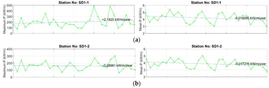 All stations in the Karaburun sub-grid have an increasing trend for yearly maximum power, while a negative (decreasing) trend is observed for the average power (Figure 10). The highest trend for the yearly maximum power is found at station 5 with +1.345 kW/m/year, while the lowest trend is observed at station 2 with +1.116 kW/m/year. For the annual average power, the lowest trend is 0.01 kW/m/year at station 6, followed by −0.02 kW/m/year at station 5 and the other stations have approximately −0.03 kW/m/year. Furthermore, it is observed that the maximum annual power has peaked at all stations in 2004. While the yearly average power variation range is 6.5 kW/m/year at the stations west of the sub-grid, it decreases to 2 kW/m/year at the eastern stations. Although there is a lower annual average wave power at the stations to the east of this sub-grid, it shows that there is an average annual wave power in a narrower strip. It is observed that there is a higher variation interval at the stations with higher annual average wave power. As seen in Figure 11, the annual maximum wave power at all stations, except for stations 4 and 5, is in an increasing trend and decreases at stations 4 and 5. There is a decreasing trend at all stations in the variation of the annual average wave power. For the yearly maximum wave power, the highest increasing trend is +2.37 kW/m/year at station 1 and a downward trend of −0.69 kW/m/year at station 5. For the annual average wave power, there has been a decreasing trend of approximately −0.02 kW/m/year at all stations. The year in which the maximum annual power value is greatest is determined as 2004 at all stations. Variations in the annual average power have generally shown a similar trend at all stations in this sub-grid.