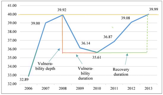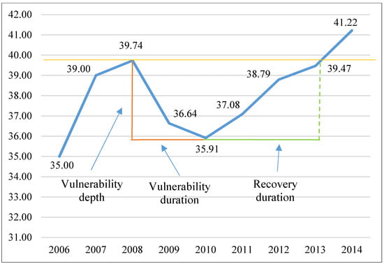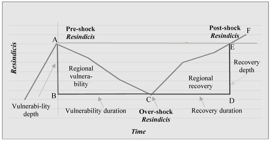 Although estimations of the Resindicis index enable the comparison and ranking of systems by their resilience, the index itself does not reveal the degree of resilience. Considering the multifaceted nature of the concept of resilience and the fact that the degree of resilience can be increased by reducing vulnerability and/or by enhancing the ability to recover, the dynamic assessment of a system’s resilience becomes extremely important. The degree of resilience will be revealed by the changes in pre-, over-, and post-shock resilience. The conceptual assessment of resilience is depicted in Figure 1.