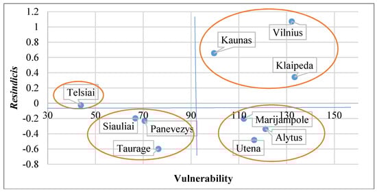 Group II is characterized by strong resilience and high vulnerability. The group combines three socio-economic systems: the Vilnius, Kaunas and Klaipeda regions (European-level regions).