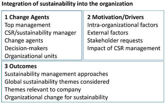 The second key lesson from the study by Kiron et al. [39] is related to organizational units. This lesson indicates that companies should set up the organization in a way that they can reach their sustainability ambitions, and thus, integrate sustainability into the organization, e.g., form cross-functional teams, set clear targets and key performance indicators. Interactions between the organizational units and levels of hierarchy are seen as catalysts for sustainability-related learning processes and, correspondingly, sustainability outcomes [18].