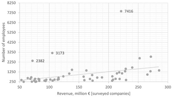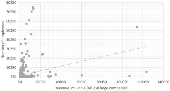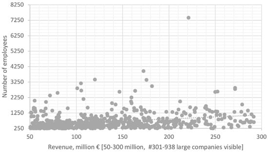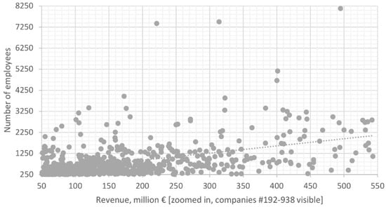 Finally, to apply consistent sample selection criteria, the revenues and numbers of employees were also used to identify and remove the largest companies (in an Austrian corporate context) from the sample. Once the remaining companies had been sorted by descending revenues, large differences in size could be observed (Figure 3). The distribution of companies (in terms of size) becomes smoother as the revenues drop below €350–250 million, as this is the range below which about two-thirds of large companies can be found (Figure 4). Hence, for the purpose of this study, the cutoff point was set at €300 million, excluding the top 300 largest companies from the sample and leaving 638 companies with revenues of €50–300 million to be contacted for the survey.