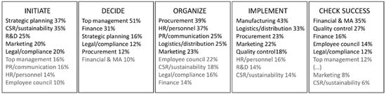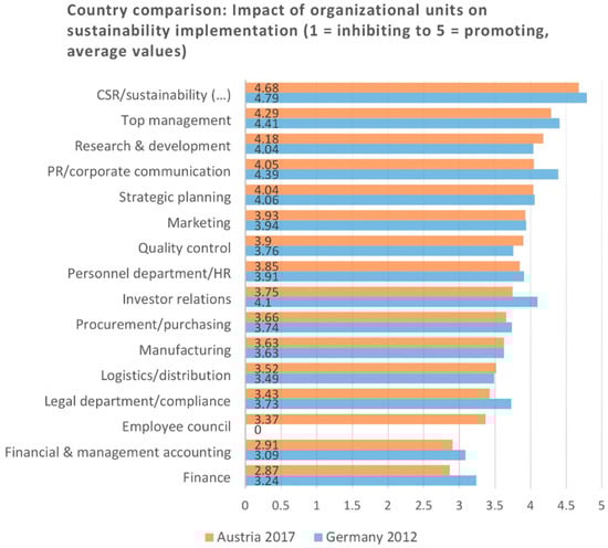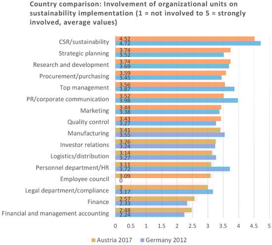 Schaltegger et al. [21] conducted a corporate sustainability survey on the largest German companies and found that the level of involvement of company organizational units depended on the ecological or social focus of the project. With respect to social themes, the most frequently involved departments were those of CSR/sustainability, HR/personnel and management, whereas the CSR/sustainability and manufacturing, R&D, procurement/purchase and PR/communication departments were involved for ecological topics. Top management and PR/communication departments were highly involved in sustainability management, showing not only their strategic relevance, but also their importance with respect to the company’s communication and reputation [21]. The International Corporate Sustainability Barometer includes surveys on the largest companies in eleven countries: Spain, Belgium, UK, France, Germany, USA, Japan, Switzerland, Hungary, Korea and Australia. In all countries, companies have on average rated organizational units as promoting for sustainability implementation, or at least as being neutral to it [22] (p. 26). Overall, the international results showed strikingly similar practices in sustainability management in developed countries [21].
