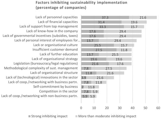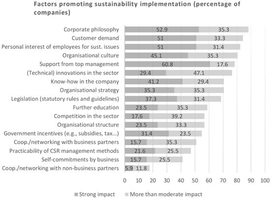 Since the individual’s attitudes and beliefs were not within the scope of the study, the individual was viewed from the ‘macro perspective’, i.e., as a part of the organizational unit and the company. Aguinis and Glavas [19] used institutional, organizational and individual levels to classify the factors identified from an extensive CSR literature review, while the study by Engert et al. [20] was referenced to obtain the strategic viewpoint and emphasis. Based on a synthesis of the results from these studies, questions about individual and organizational factors, such as the concern for CSR, CEO support and company’s alignment of mission and vision, were included in the survey design. In a domestic context, case studies in Austria have shown that legal regulations, leadership, organizational culture, employee interest and willingness to implement projects are drivers for business models for sustainability [14] (p. 151). These results were tested in part with the current quantitative study.