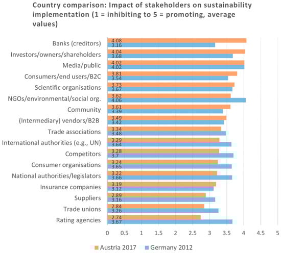 In line with the limited scope of this research, four further studies were considered as being of relevance for the survey design. Customers, regulators and investors are considered to be the most influential stakeholders in Belgian companies [26]. Over the past years, requests from customers and employees have lost their negative connotation in Belgian companies, and are now perceived as opportunities to develop new products or services [38]. In case studies conducted with Austrian companies, competition and customer demand do not appear to be the main external drivers for the transformation towards sustainability, unlike what authors of one study had expected [14] (p. 149). These factors were, therefore, included for validation in the survey. Regarding stakeholder involvement, the largest companies in Germany benefit from NGOs and media/public as their external stakeholders for sustainability implementation, since these help them build up and preserve the legitimacy of their motives for sustainability management. Financial markets have gained importance with regard to corporate sustainability; this is also reflected in the positive ratings of competitors, shareholders and rating agencies by surveyed companies. Suppliers, insurance agencies and banks are not considered to be helpful for the promotion of sustainability management [21].