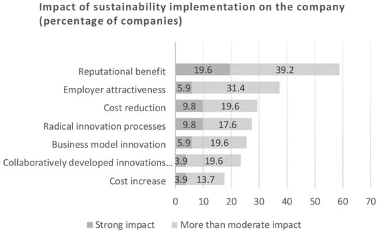 The top five reasons why companies in Belgium implemented corporate responsibility management measures were (i) positive impact on their reputation, (ii) building relationship with stakeholders, (iii) employee motivation, (iv) contribution to innovation of products/services, and (v) obtaining support to comply with regulations [26] (p. 13). A study conducted on the largest German companies showed that companies implement measures that improve efficiency, manage risks and improve the company’s reputation [21]. Innovation is rarely the driver for sustainability measures; even though sustainability-oriented innovations are the key to solving damaging problems in the production processes and with products, and the key to directing sustainability management towards the market [21].